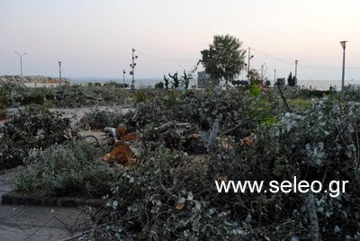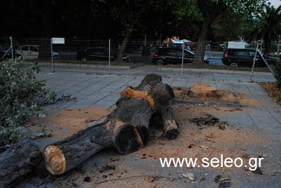 Δεντρα που χρειαστηκαν χρονια (η ηλικια τους φαινετε ξεκαθαρα αλλωστε στους "κυκλους" ων κορμων τους) για να γινουν ,και που τοσο αναγκη εχει αυτη η πολη, χαθηκαν σε λιγα λεπτα στο βωμο της...αναπλασης στην παραλια. Σχεδον ενα ολοκληρο αλσος σε αριθμο, κοπηκε και εξφανιστηκε σε λιγη ωρα και ο χωρος γυρω απο το αγαλμα εχει αυτη την εικονα...