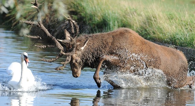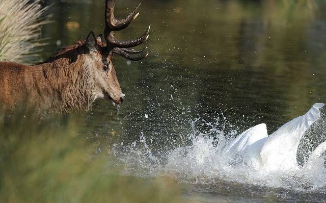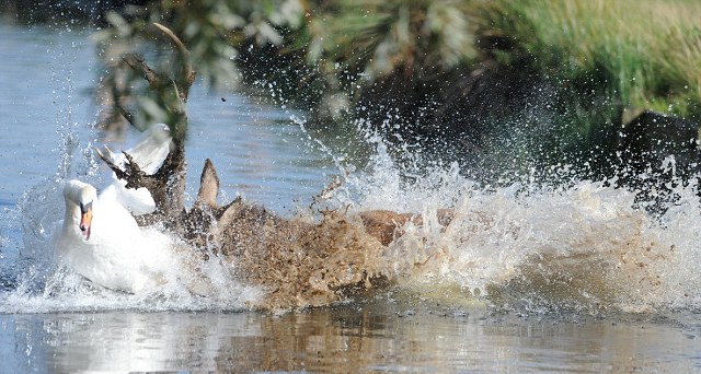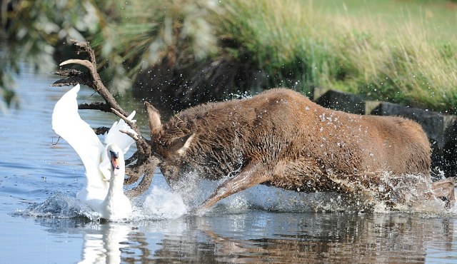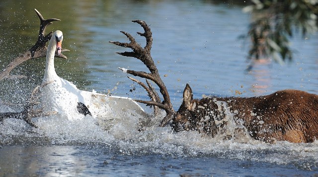 Τη στιγμή που ένα αρσενικό ελάφι επιτίθετο σε έναν ανυποψίαστο κύκνο που έκανε αμέριμνος τη βόλτα του στα νερά ενός καναλιού στο πάρκο Bushy Park στο Richmond «έπιασε» ο φωτογραφικός φακός.